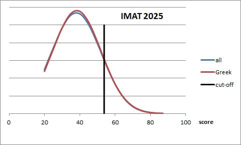 This statistical analysis uses data from the IMAT results that students receive. Greek candidates are identified from their names but some names could be wrongly assigned as Greek. This year's cut-off score in the first round is 53.8 points. Greek candidates (who number about 1300) show almost indistinguishable performance compared to the rest of the candidates. Scores below 20 are not published so data from the low tail of the distribution is missing and the mean is inferred from a truncated normal fit. About 1 in 10 candidates succeeds in this test. The test is effective in producing normally distributed results with a slight right skew as negative scoring has a stronger effect on the weaker candidates.
